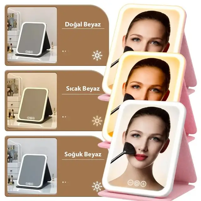 Powermaster PM-27372 Dc 5V Işıklı 3 Renk Modlu Şarjlı Katlanabilir Ledli Küçük Boy Profesyonel Makyaj Aynası